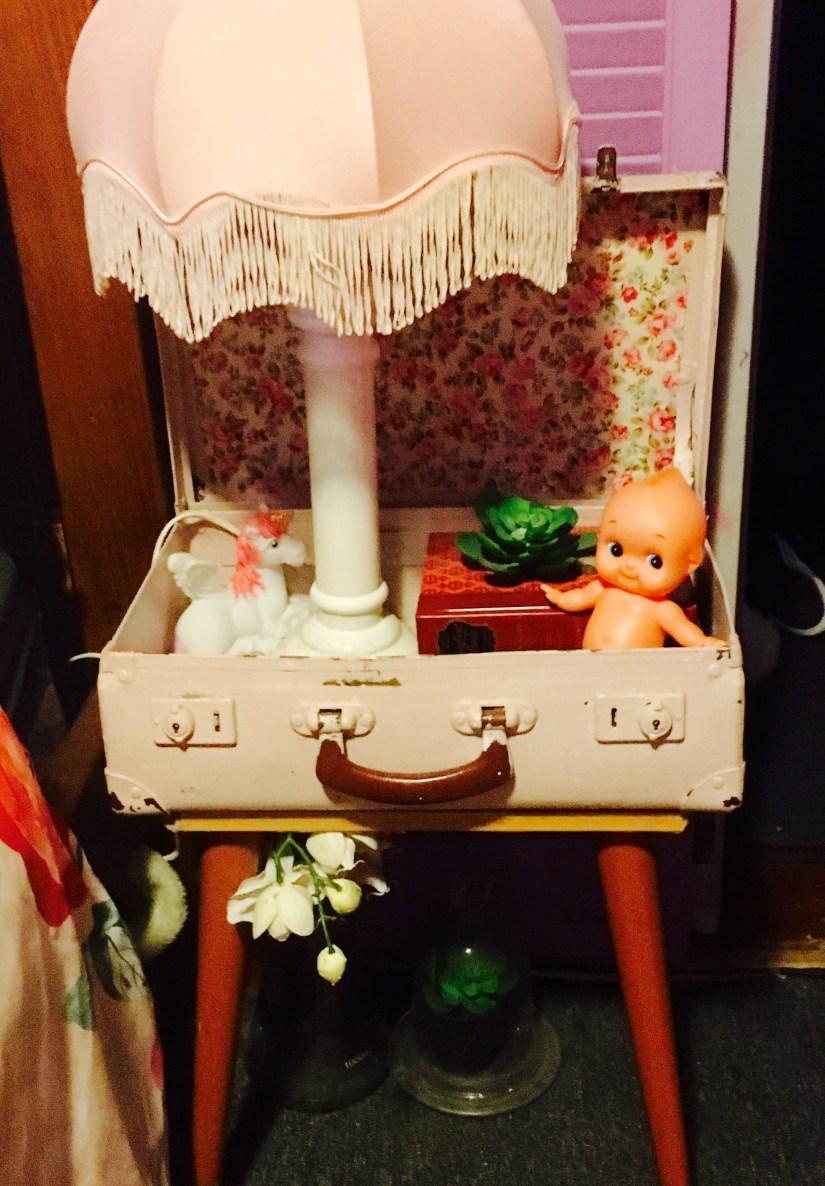 4. A vintage suitcase can be made into a bedside table. Get your hands on a vintage side table or the legs from one. I love the look of vintage designer Eames table legs. You can purchase the legs in second hand stores or online. Then to make the suitcase sturdy, screw the legs to a piece of wood, cut to the exact size of the suitcase, and screw the suitcase to the wood. Glue some vintage paper to the inside of the suitcase. Leave the lid of the suitcase up and put in your bedside lamp, or any other cute vintage items you would like to display. You could also use it as a side table in your lounge room and keep the lid closed, for extra storage.