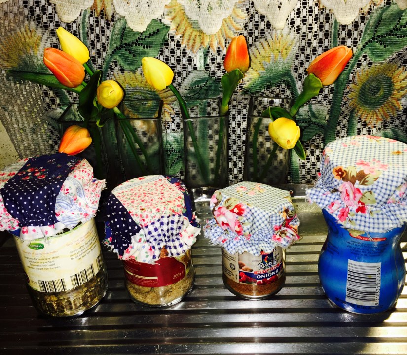 A different way to use your shower caps, is to make fabric jar covers for different bottles and containers in your kitchen! Follow all the same steps, just use a smaller circle template.