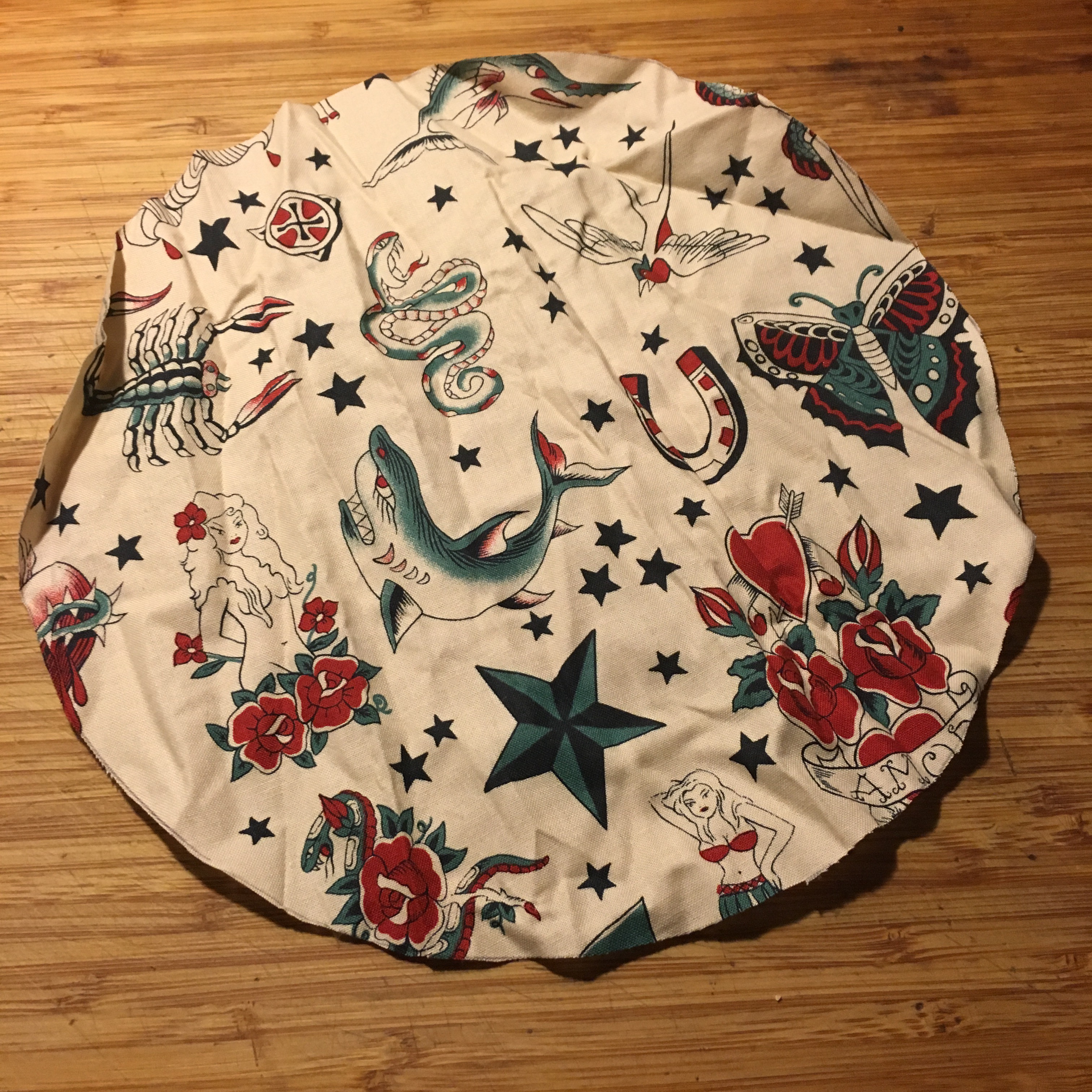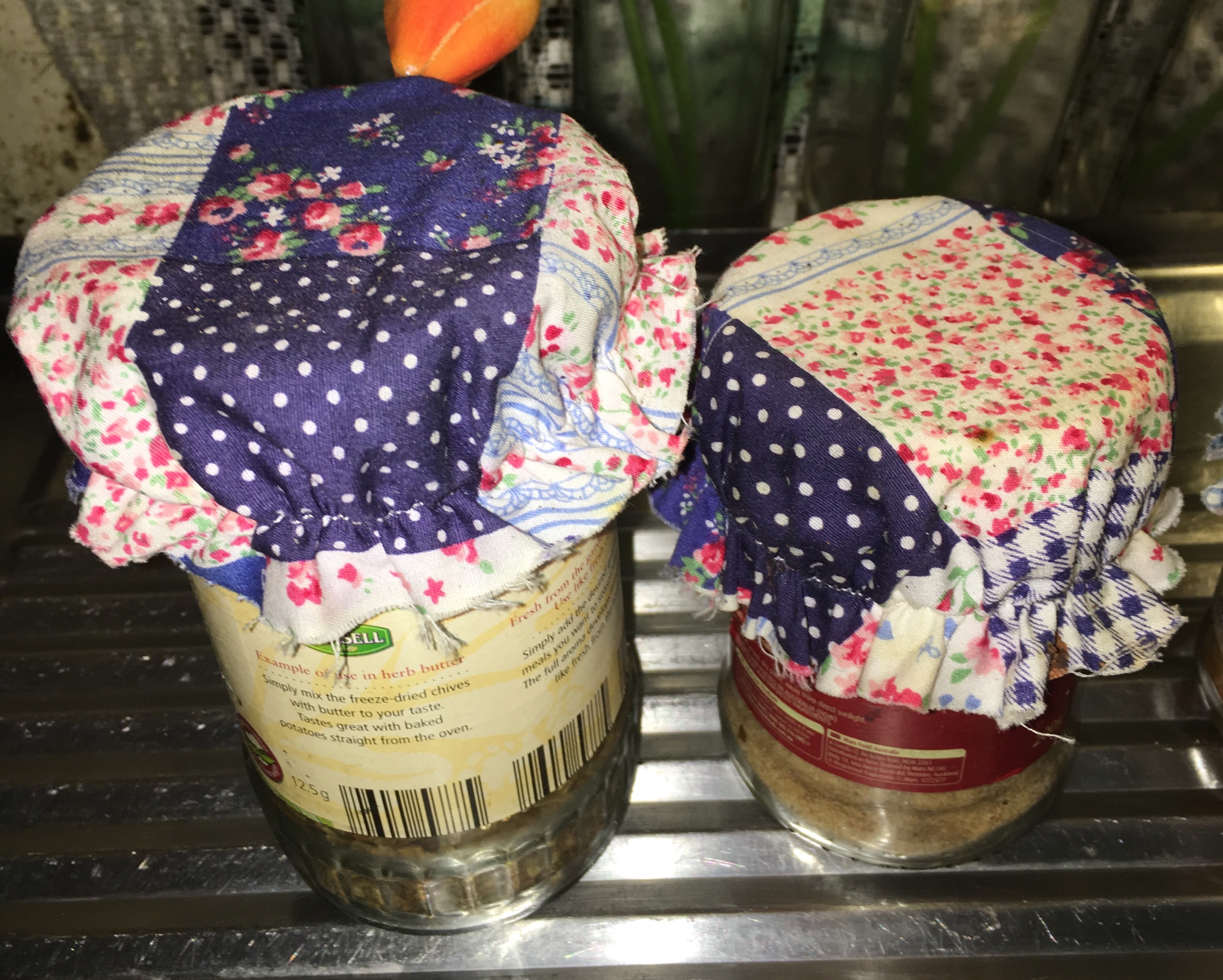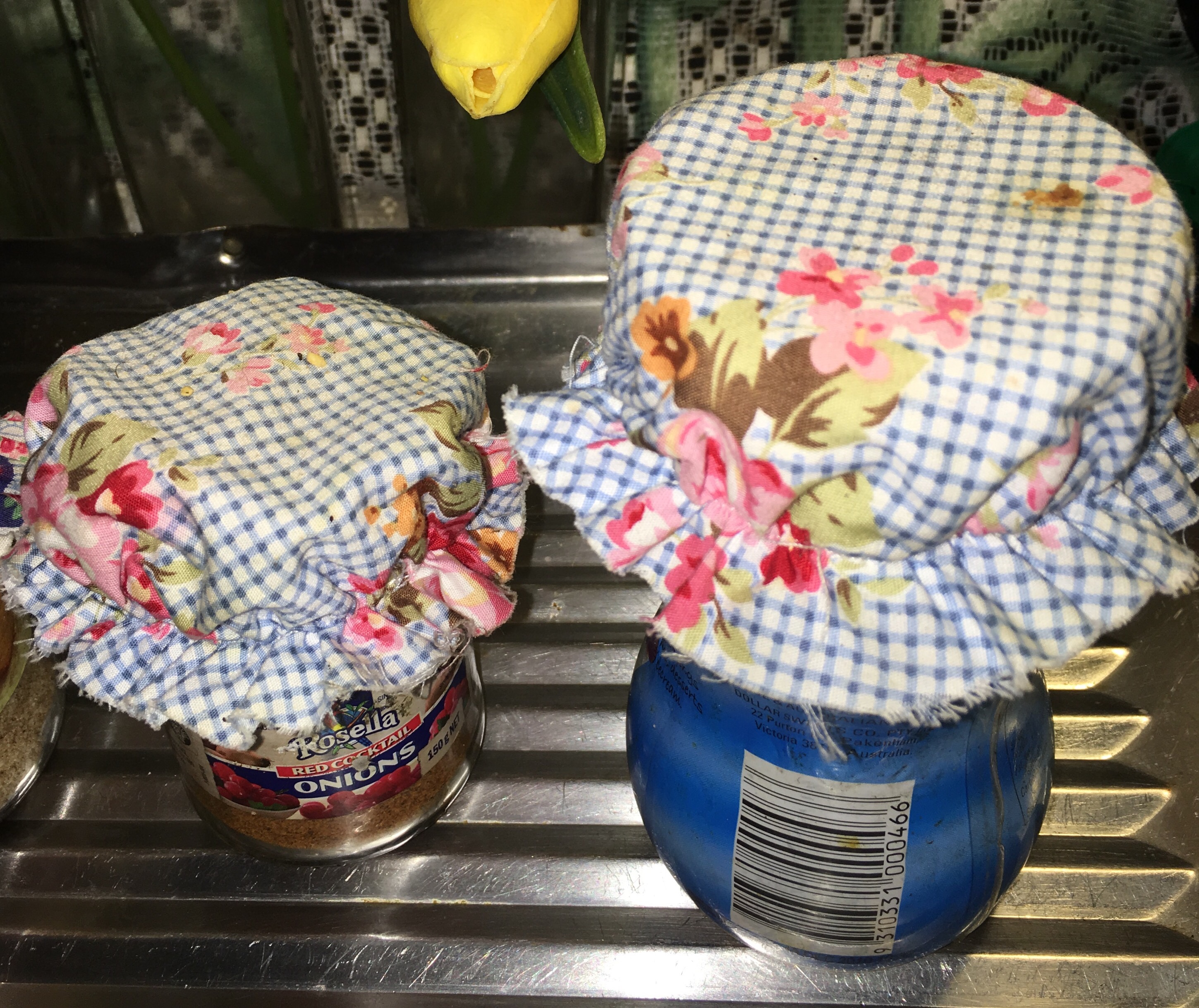 A different way to use your shower caps, is to make fabric jar covers for different bottles and containers in your kitchen! Follow all the same steps, just use a smaller circle template.