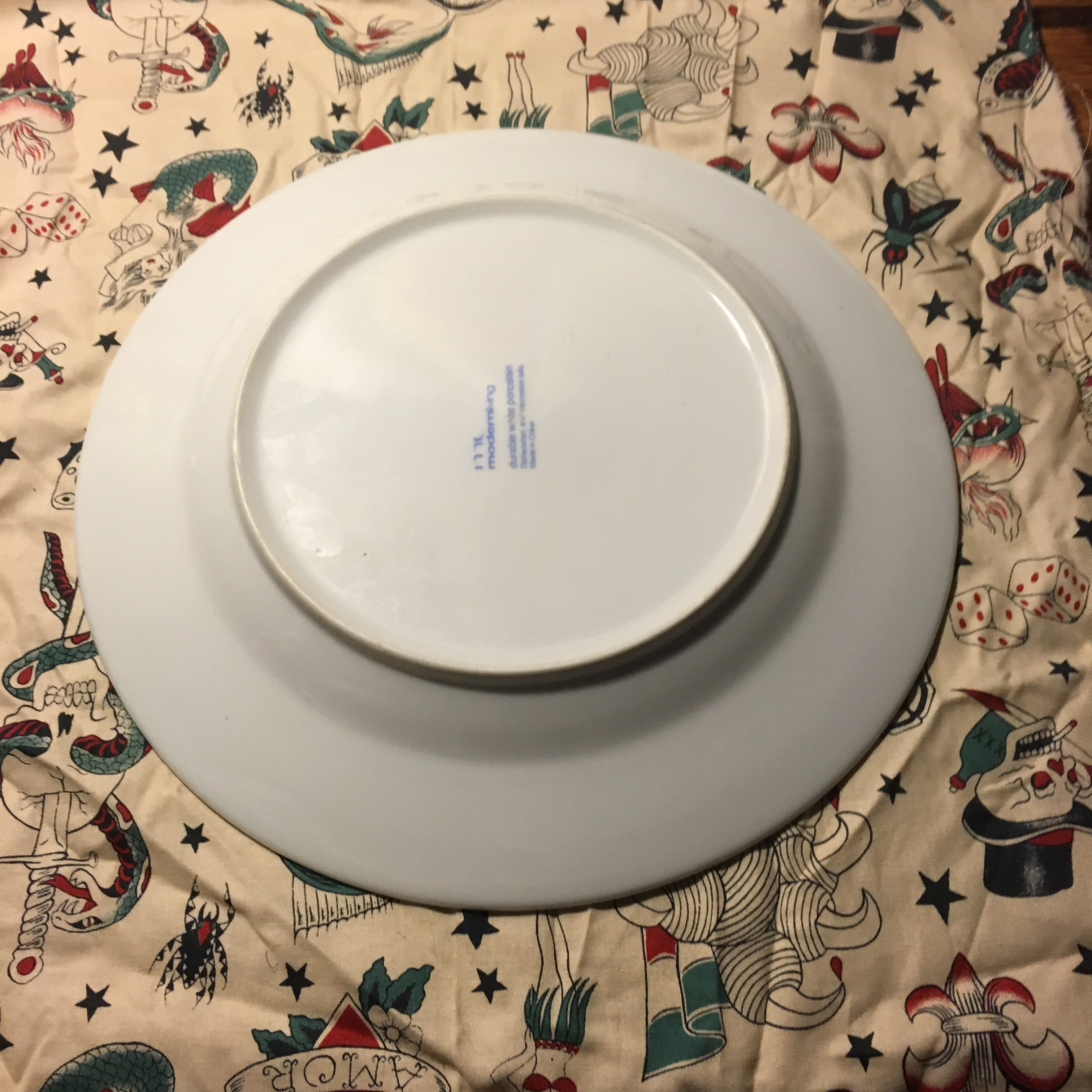 - Place your material on a hard surface and use your large round template, like I have used the serving plate, to trace the circle on the fabric. The circle needs to be a bigger width than the circumference of your head.