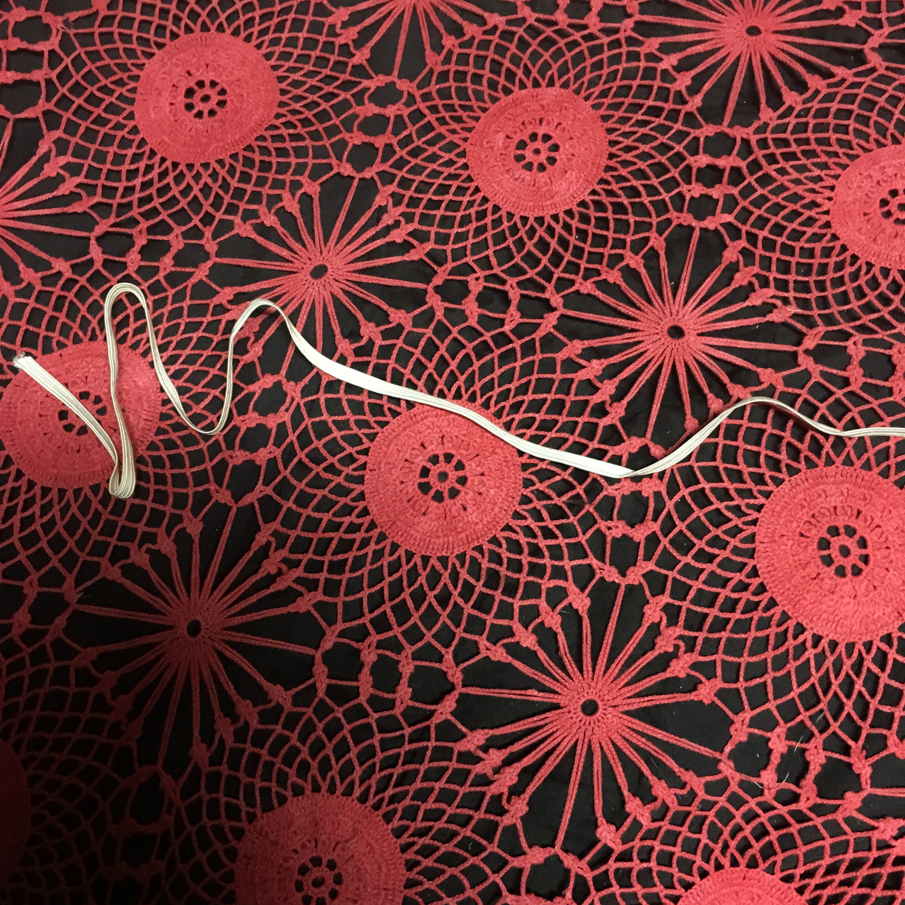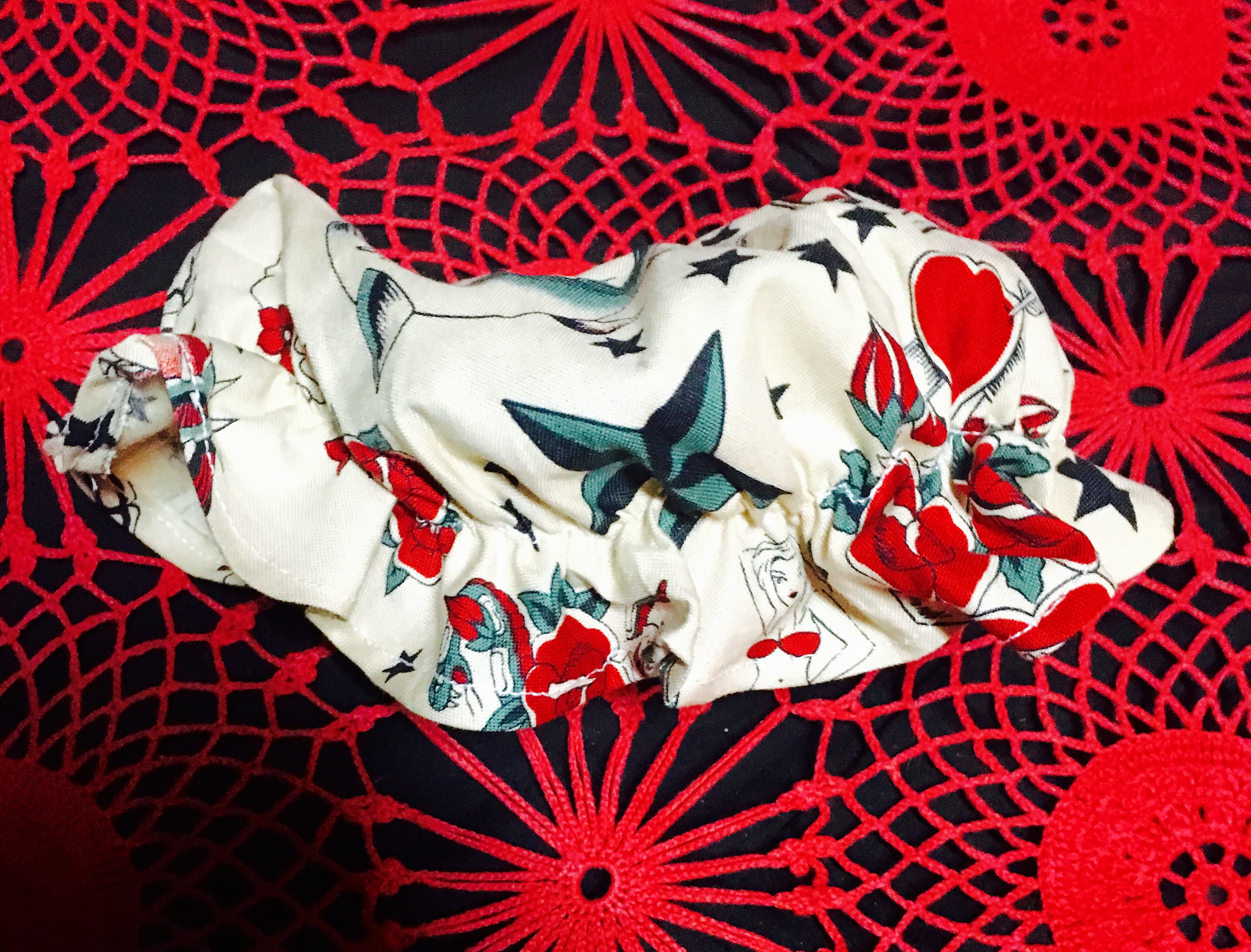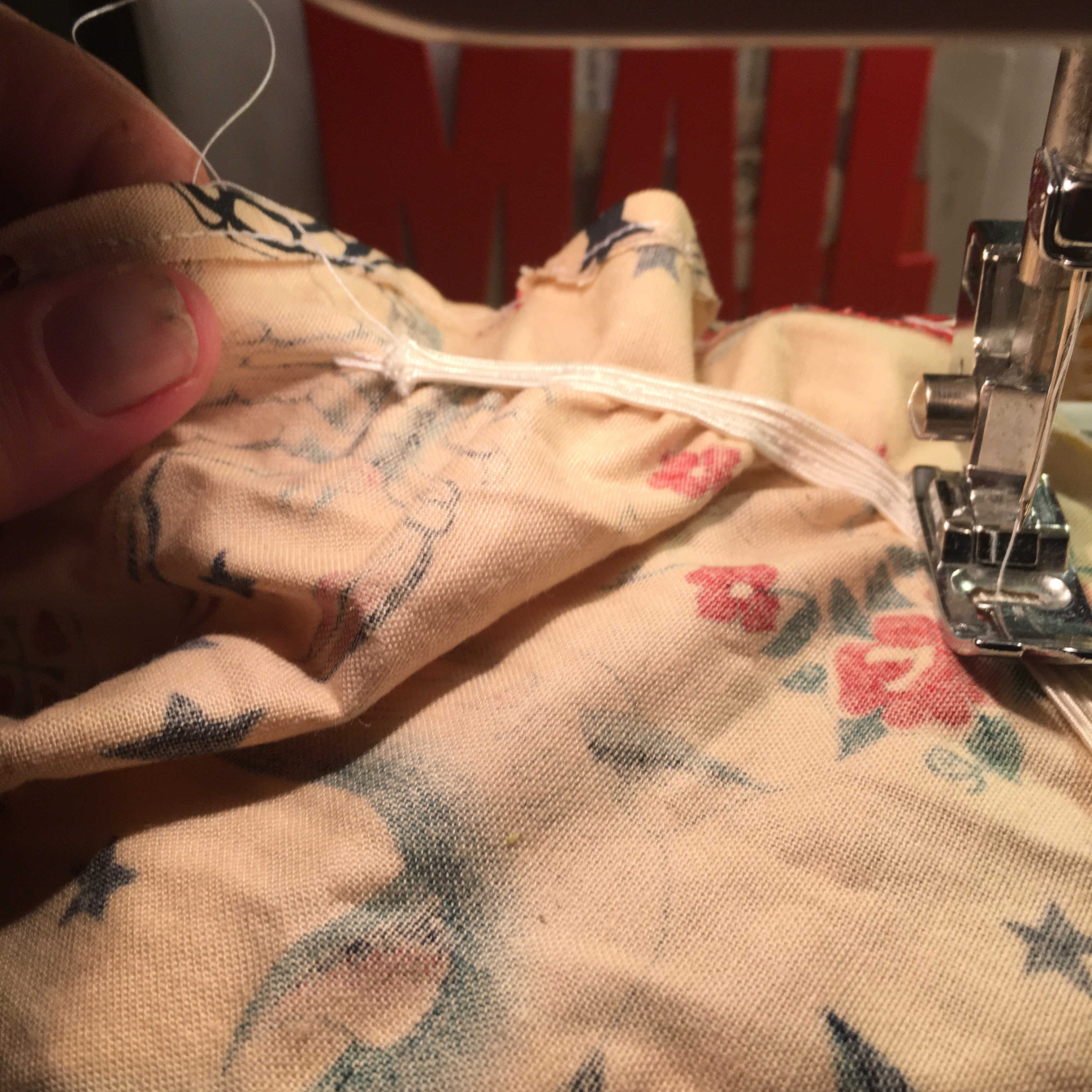 - Cut the elastic slightly smaller than your head width. Sew the elastic to the wrong side of the fabric, 5cm from the edge. This will allow a frill to form at the bottom edge. You can pin it prior to sewing it to make sure you get it right around the circle. (As you sew or pin the elastic, pull the elastic slightly to make sure it can be sewn into a full circle and give a slight gathered appearance)