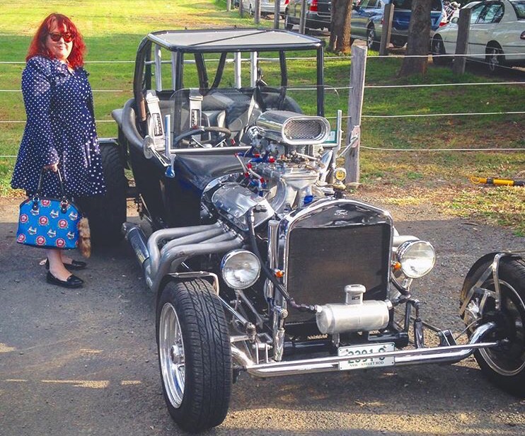 Blue and white polka dot full coat matched with a blue and white polka dress. I am at a rockabilly festival at Picton
