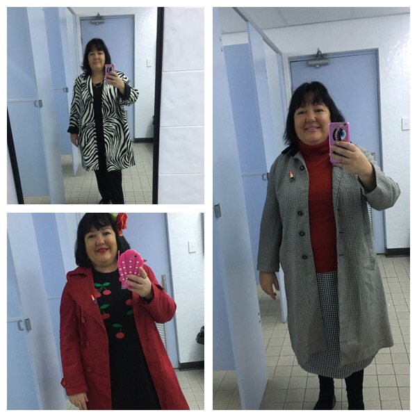 Top left: Zebra Print Coat, Bottom Left: Red Coat, Right: Houndstooth Coat with matching houndstooth skirt