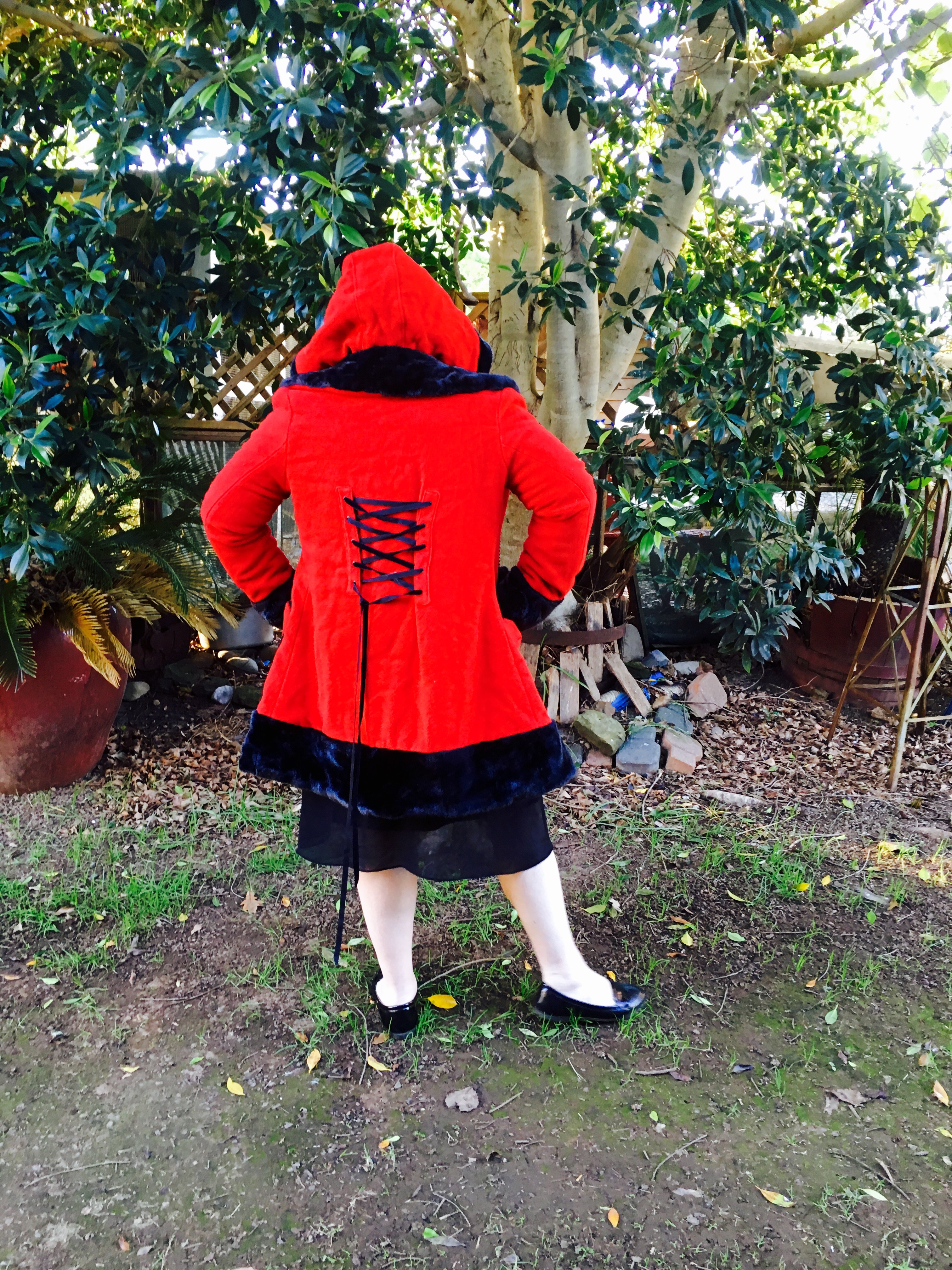 This recent purchase is Hell Bunny Sarah Jane coat in red, with black fur trim, a hood and lace up back. It is really warm and is stylish design. I love it!