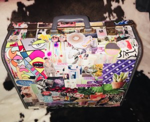Use a strong craft glue and stick your pictures on. With a small paint brush, spread the glue out evenly on the back of the picture. Glue the images where you prefer, as you can see I preferred to cover all sides of my suitcase!