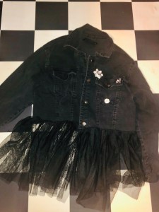 I purchased this jacket already like this, but this an easy DIY project. This denim jacket has tulle added to the bottom and bling badges pinned. All you need to do is purchase tulle and sew it to the inside of the hem of the denim jacket. You can sew on as many layers of the tulle depending on the look you desire or you can gather the tulle and sew along the hemline.