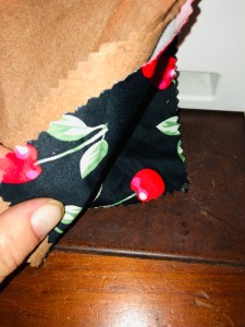 3. When you have pulled it completely through to the right side. Use a knitting needle or something similar to push the corners to check they are through completely. Then you can finish sewing the seam closed. As you sew the seam closed you can use ribbon to make a loop for easy hanging.