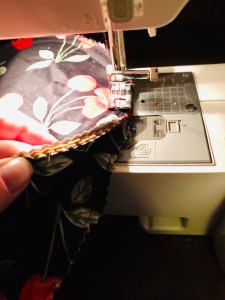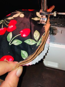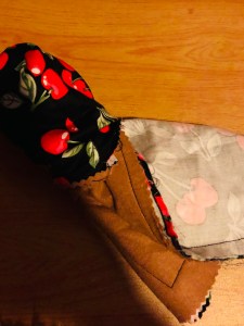 6. Now you can pin the two sewn pieces together leaving the bottom piece open, as this allows your hand to enter. On one side before you get to the end of the seam add a ribbon loop along the seam (do the loop on the inside as we will be turning the glove through so the seams are on the inside & the hoop will then be on the outside ) This loop will allow you to hang your mitt, see picture below.