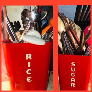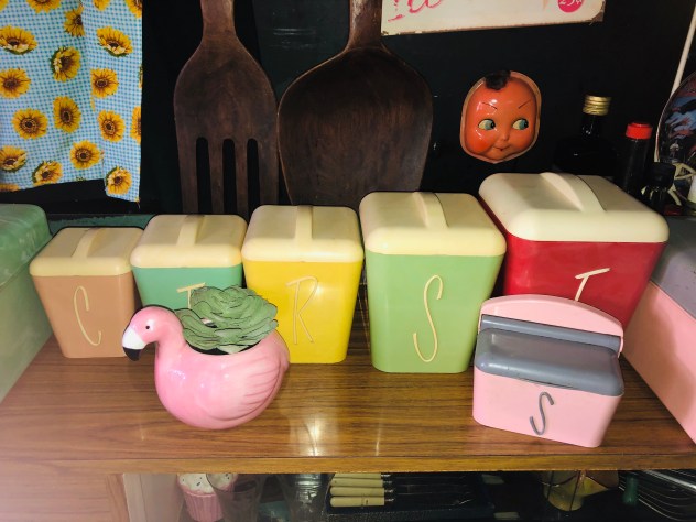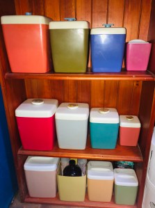 Retro canisters can really brighten up your kitchen! Canisters, such as Gayware, are not sealed tight and so should not be used to keep things fresh over long periods of time. But they are handy for things when clipped closed in their packaging like biscuits, cereals, flour, pasta, lollies, bread, nuts, herbs, etc… The older enamel canisters, such as the ones pictured below with green writing, are heavier and do seal a bit better, though not suction sealed.