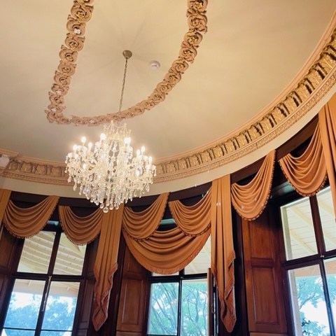 Above is a photo of the prestigious homestead and below is photos within the house. You will see the exquisite details that they put into the features, such as the lacework on the ceilings. The walls in the formal lounge were red fabric. The windows had wood coverings on the inside that closed up the windows. The curtains were divine thick fabric.